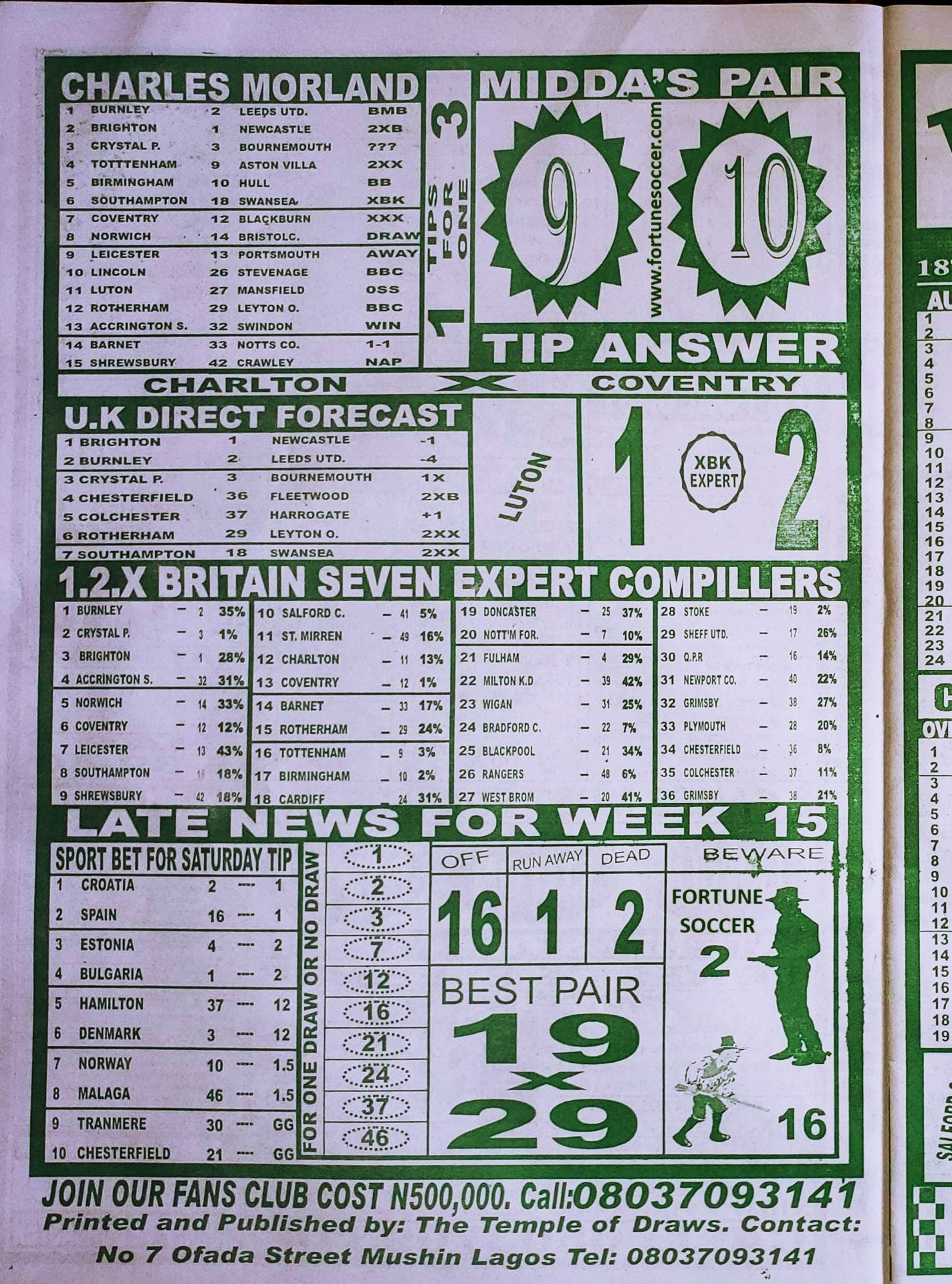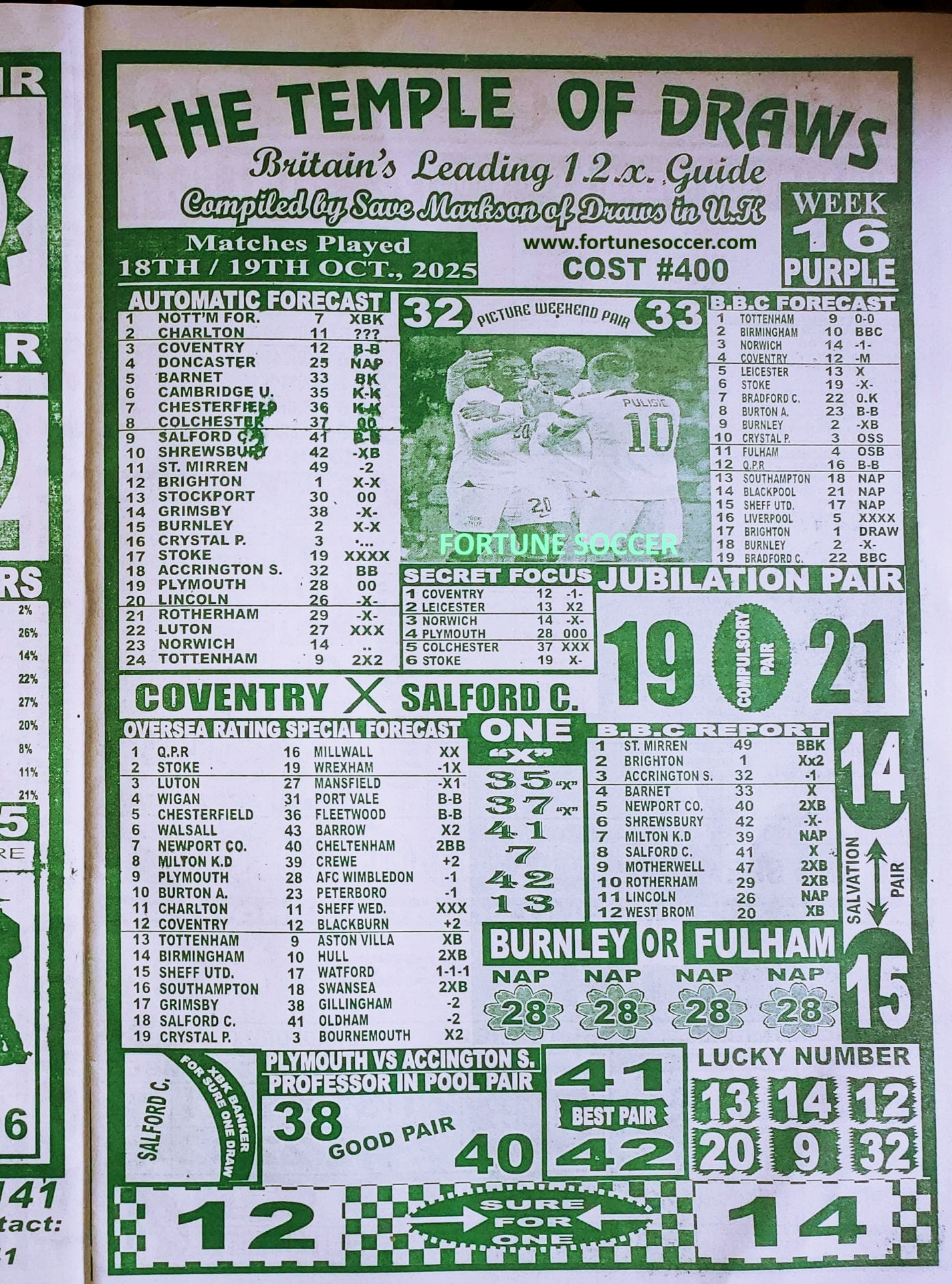We publish the world’s leading weekend football pool forecasting papers poised to boost your winning chances. Apart from CBK papers we also publish late news papers like Dream International Research, Bigwin Soccer Temple of Draws, and Mirror Punters Guide. Week 16 late news pool paper 2025