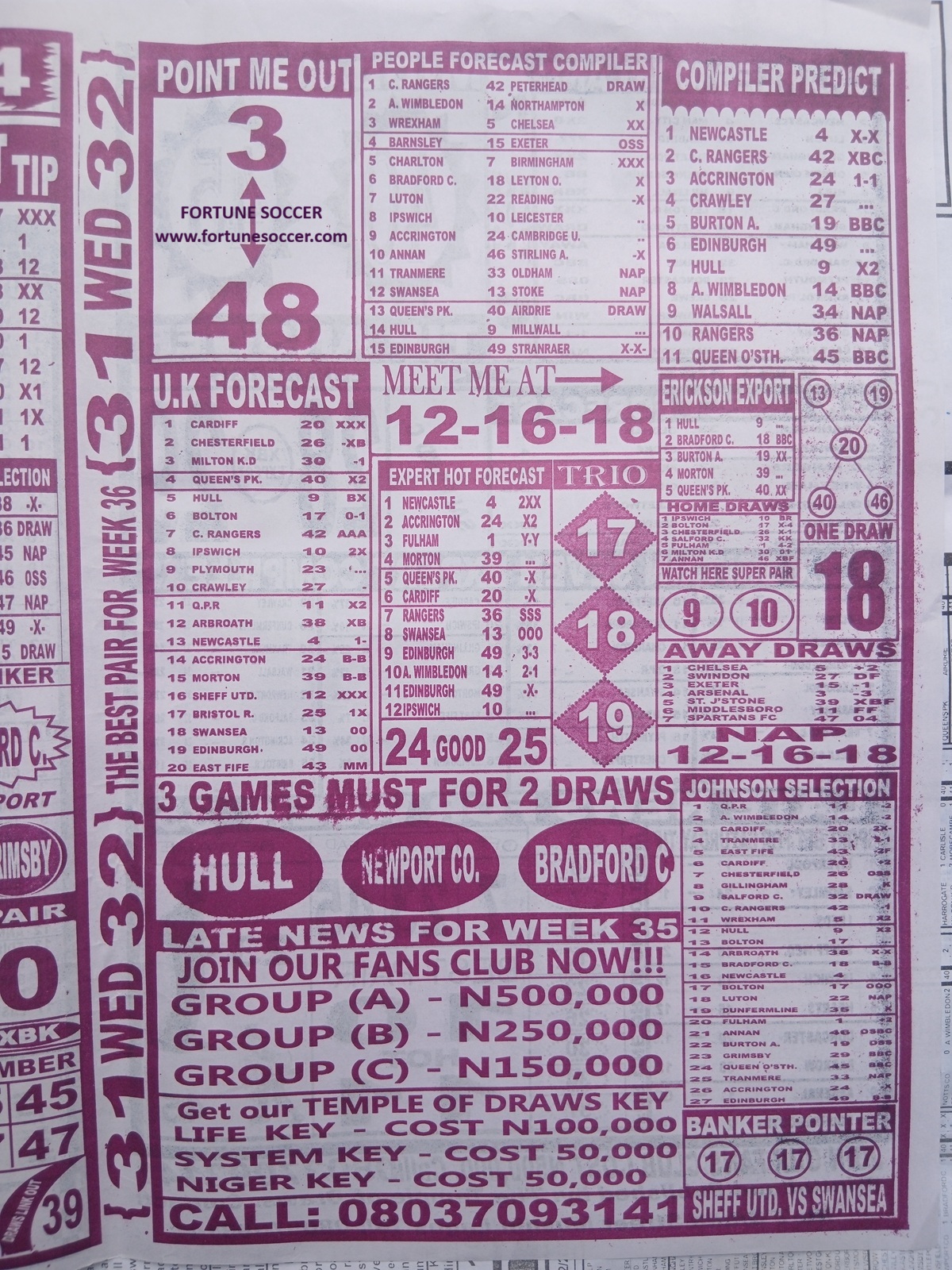 Fortune ‘X’ Matrix is released every ‘Sunday,” visit the online football pools papers store using this LINK to get a copy of Fortune ‘X’ Matrix.