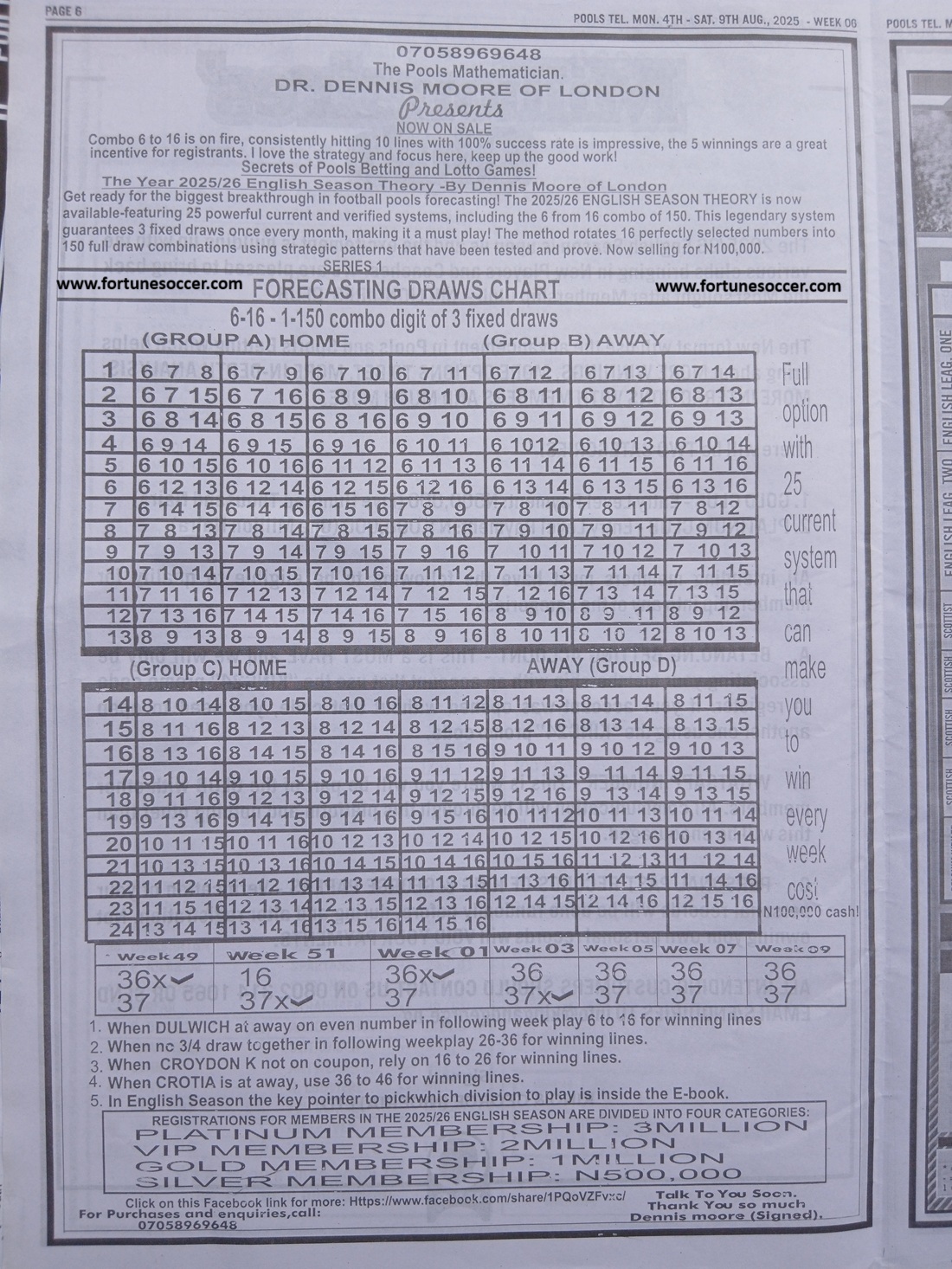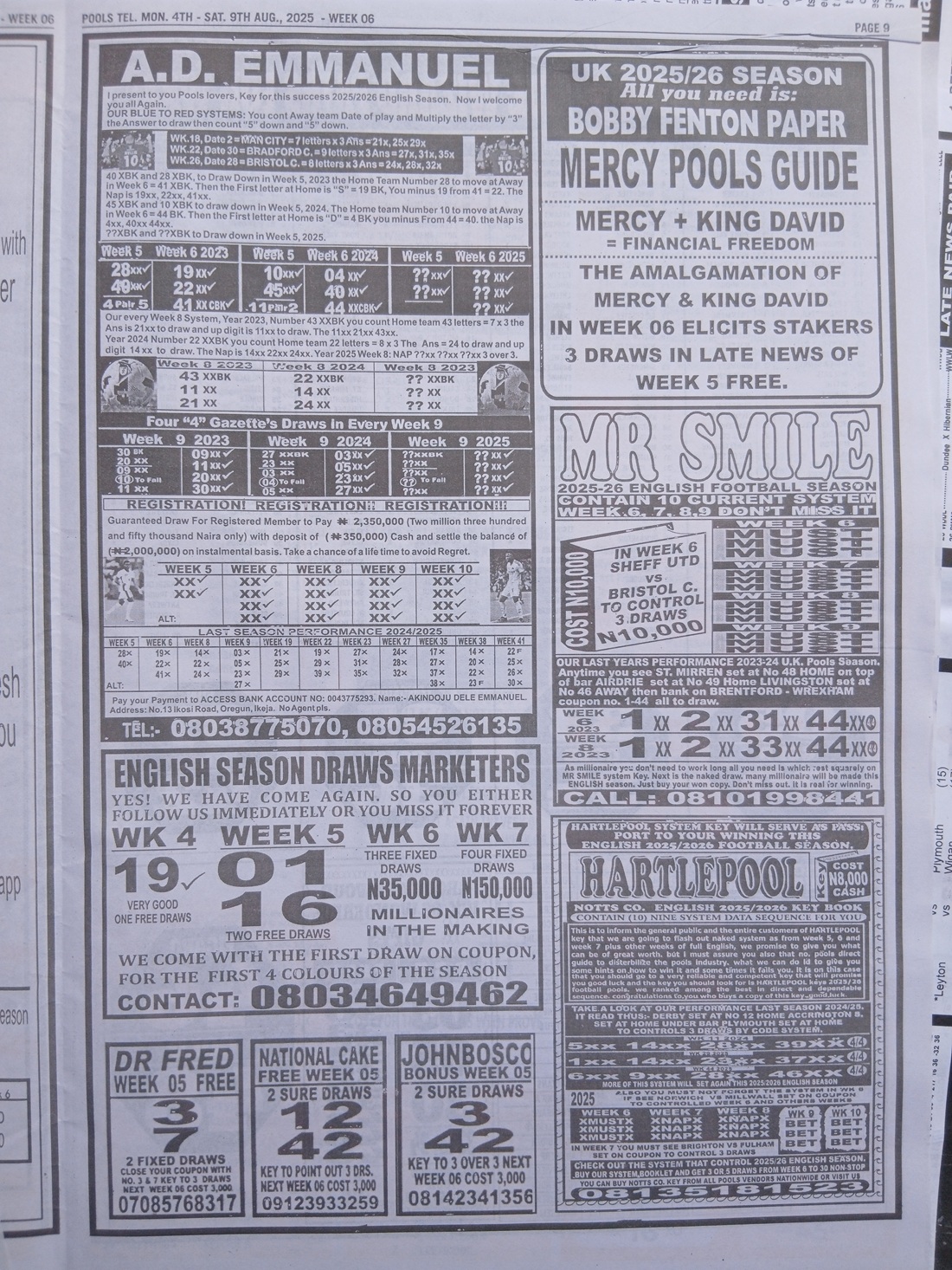 Week 6 late news papers 2025: Here we provide you with the best football pool papers such as Dream International Research (comes with Late News), Fortune ‘X’ Matrix, and Dream International Fixtures.