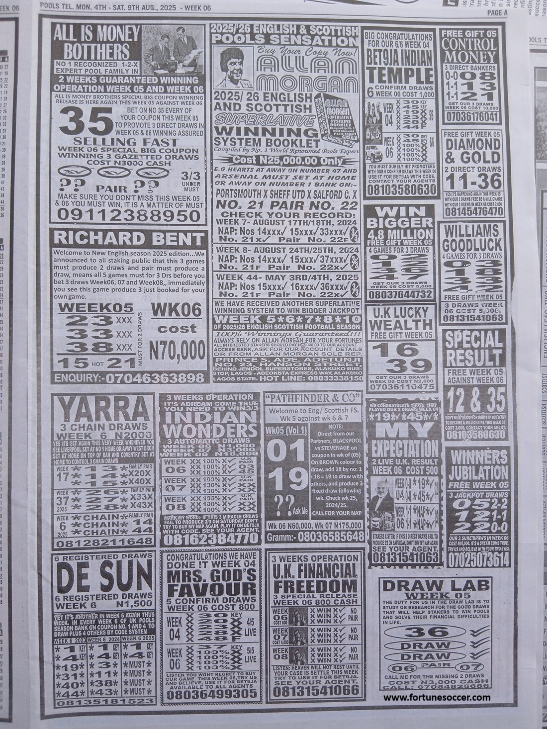 We publish the world’s leading weekend football pool forecasting papers poised to boost your winning chances. Apart from CBK papers we also publish late news papers like Dream International Research and Bigwin Soccer. Week 6 late news pool paper 2025